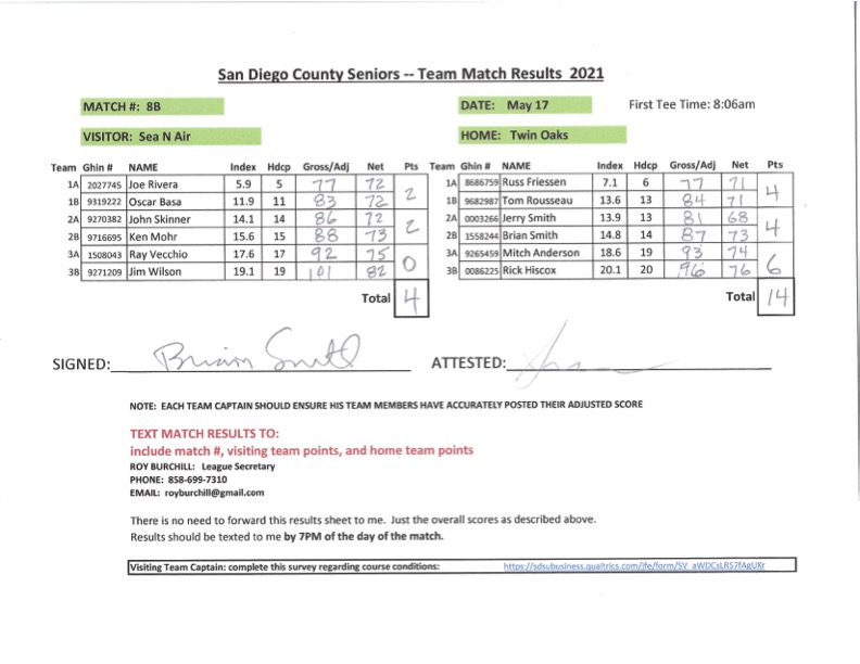 Team 1 started a little slow but came back strong on the back nine to win 4-2. Team 2, led by Jerry Smith’s four birdies and 34 on the front nine won 4-2. And Team 3 led by late replacements Mitch and Rick, played a very hard fought match winning 6-0.