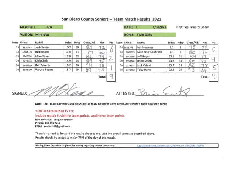 Team 1 shot lights out with scores of 75 & 80 only to lose 0-6 to two higher handicappers shooting 77 & 82. Team 2 lost the front 9 but were able to rebound to take the back 9 and total for a 4-2 win. Team 3 blew away the competition lead by Toby Dunn’s 93 (net 69) to win the match 5-1.