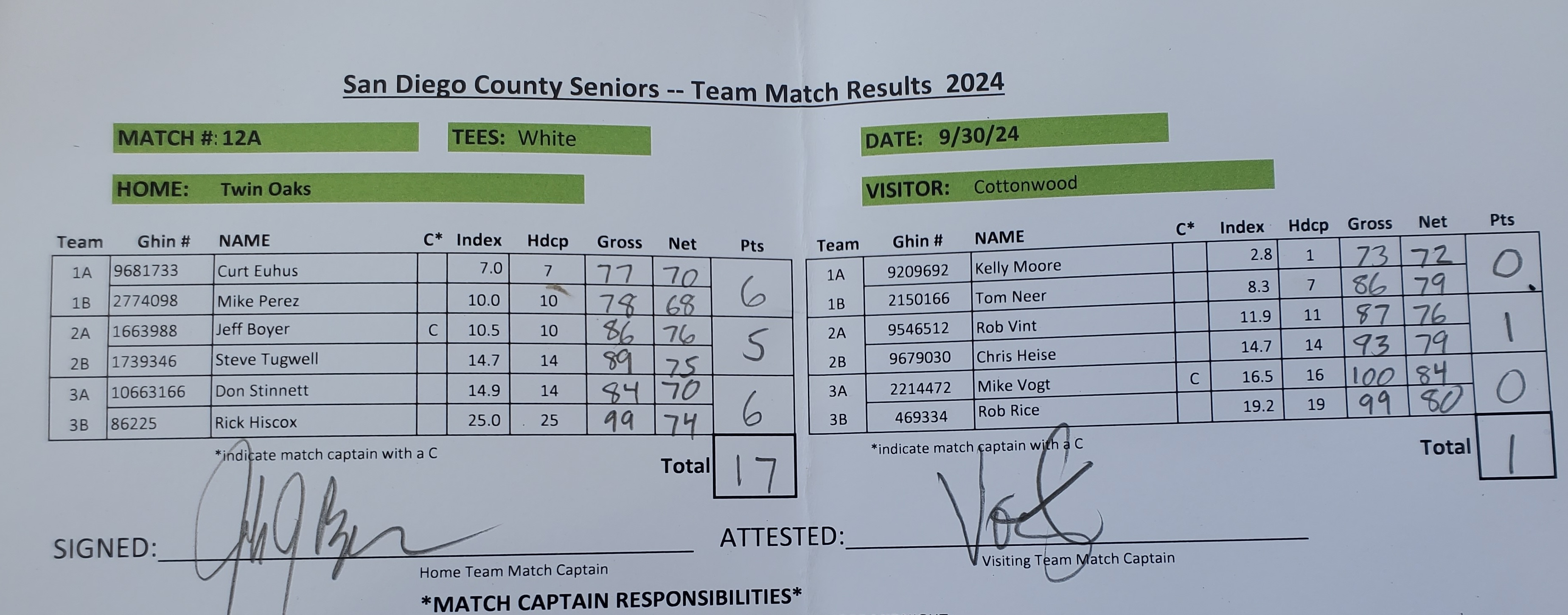 It was great …. Team A : Curt Euhus and Mike Perez both broke 80 to beat their opponents … one of which was a one handicap at Twin Oaks!